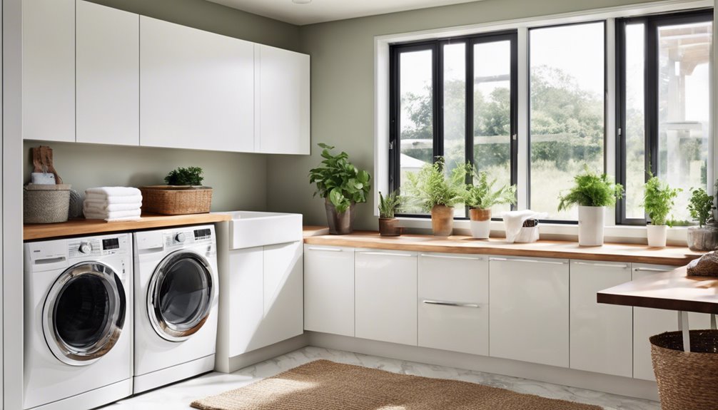 Aby zorganizować swoją pralnię dla wygody i praktyczności, zacznij od wyboru uspokajającej palety kolorów, aby stworzyć przytulną atmosferę. Użyj materiałów odpornych na wilgoć do ścian i podłóg, a także zapewnij odpowiednią wentylację, aby zarządzać wilgocią. Stwórz efektywny układ z wydzielonymi strefami do prania, składania i prasowania. Wprowadź półki montowane na ścianie oraz kosze do sortowania, aby zapewnić łatwy dostęp i organizację. Rozważ dodanie zlewu użytkowego i mobilnych wózków do łatwego transportu prania. Nie zapomnij o wprowadzeniu odpowiedniego oświetlenia i wygodnych miejsc siedzących. Jeśli jesteś ciekawy innych wskazówek i trendów, jest wiele więcej do odkrycia!